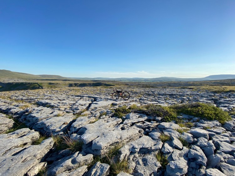 The Limestone ground shaped by years of erosion lay before me, cravasis between the stones awaiting the ankles of adventurers. The hidden microclimates between these housing rare flowers, the only remnants of the once ancient woodlands that once stood in this location. It wasn’t possible to push the bike over this. It would take far too long. My only option was to carry the bike over. I bent down and picked up the bike, tentatively I progressed. The pedal digging into my back, my arms bent back trying to balance the weight and with all I had, hoping from one rock to another, planning two rocks in advance making sure, hoping, I was as careful enough to avoid injury. This was a different type of adventure, my heartbeat was racing. After some time, I reached the trig point and admired the views. My breath returned after a few deep breaths and some welcome food and water. I relaxed for all of two minutes before looking back to where I had come from. That was my only way down.