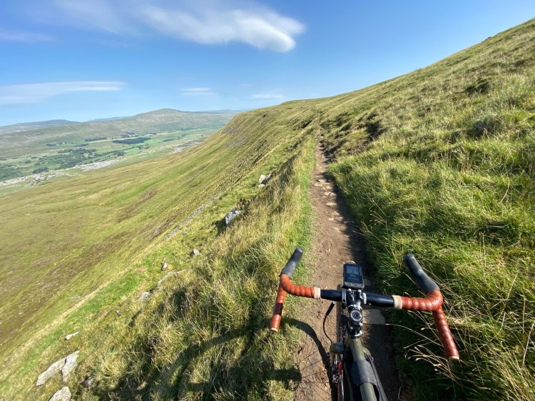 I received more looks of bewilderment from onlookers as I pedaled the bike to the trig point and took my pictures. I reached the summit of Ingleborough (723m or 2,372 ft) in just under four hours since my last trig point. The panoramic views from the top were incredible. The wind, more than a soft breeze threatening to blow my bike out of my hands, the lush Yorkshire valleys below created by historic floods now filled with wildlife blossomed in the now late morning sun. it was a special feeling. The sense of achievement overwhelmed me a few seconds before I looked at my map. Again, I had to get down the same way I got up.