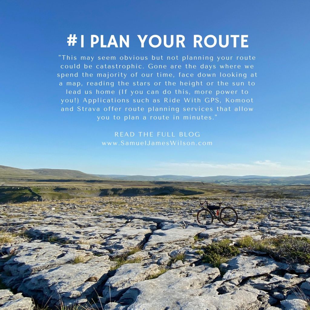 This may seem obvious but not planning your route could be catastrophic. Gone are the days where we spend the majority of our time, face down looking at a map, reading the stars or the height or the sun to lead us home (If you can do this, more power to you!) Applications such as Ride With GPS, Komoot and Strava offer route planning services that allow you to plan a route in minutes.