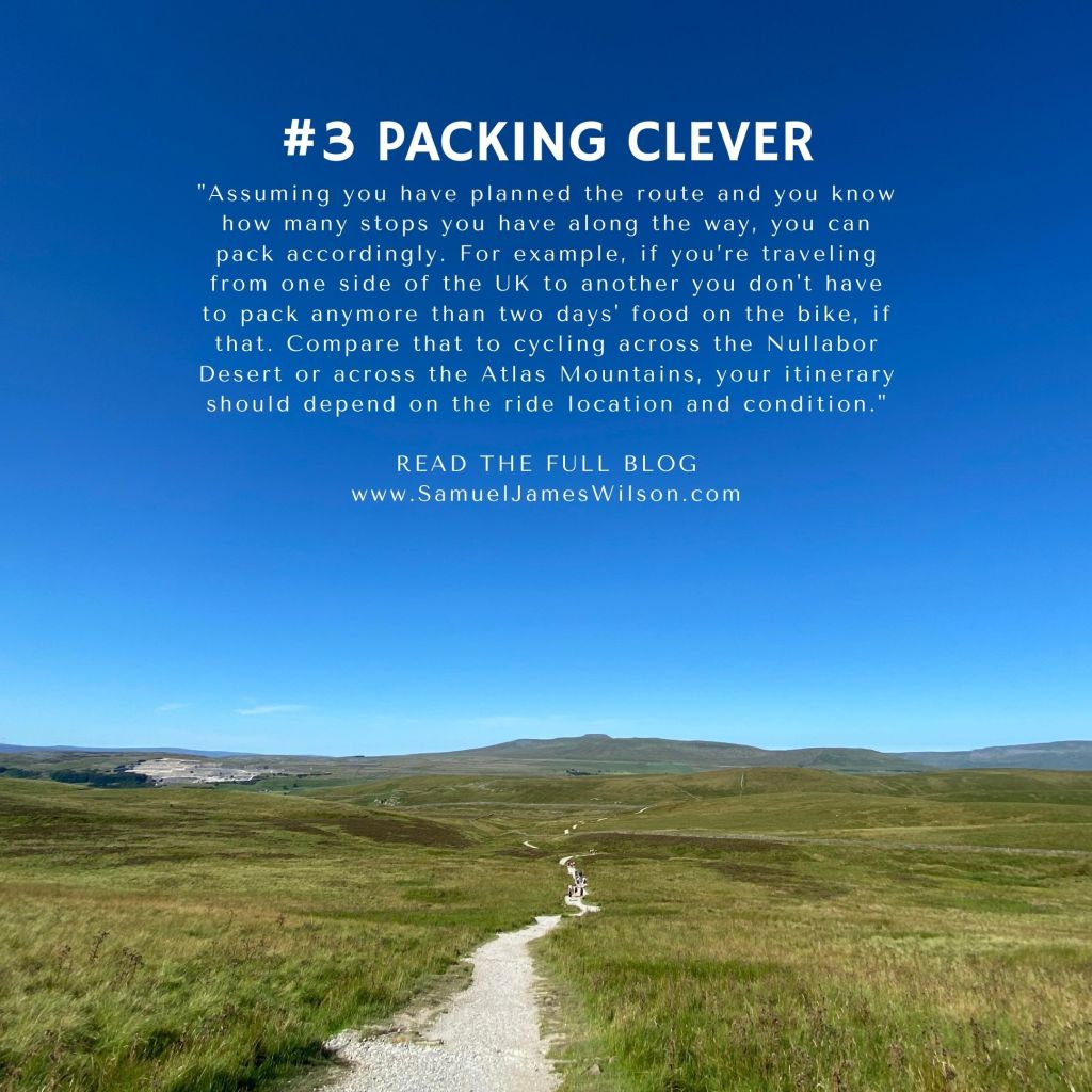Assuming you have planned the route and you know how many stops you have along the way, you can pack accordingly. For example, if you’re traveling from one side of the UK to another you don’t have to pack anymore than two days’ food on the bike, if that. Compare that to cycling across the Nullabor Desert or across the Atlas Mountains, your itinerary should depend on the ride location and condition.