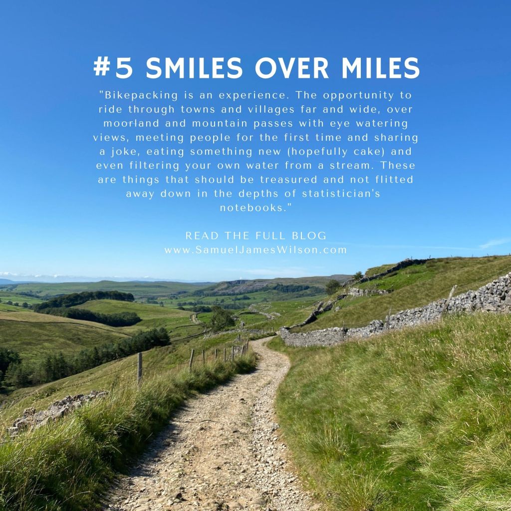 However, that is not Bikepacking or how I see it anyway. Bikepacking is an experience. The opportunity to ride through towns and villages far and wide, over moorland and mountain passes with eye watering views, meeting people for the first time and sharing a joke, eating something new (hopefully cake) and even filtering your own water from a stream. These are things that should be treasured and not flitted away down in the depths of statistician’s notebooks.